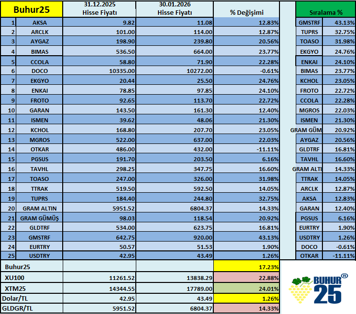 Buhur25 Orta ve Uzun Vadeli Yatırım İzleme Listesinde 2026 yılı Ocak ayını GMSTRf lider olarak tamamladı.