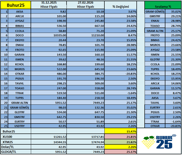 Buhur25 Orta ve Uzun Vadeli Yatırım İzleme Listesinde 2026 yılı Ocak – Şubat ayını Gram Gümüş lider olarak tamamladı.